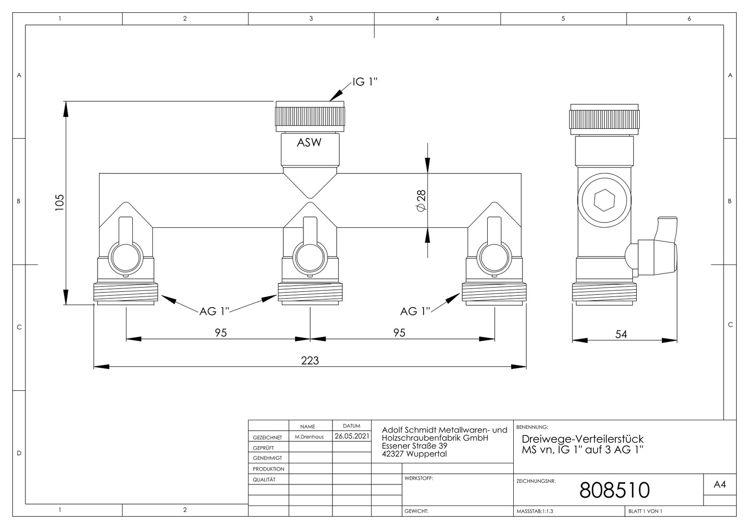 ASW Dreiwege-Verteilerstück IG 1" auf 3 AG 1", Messing vernickelt AS808510