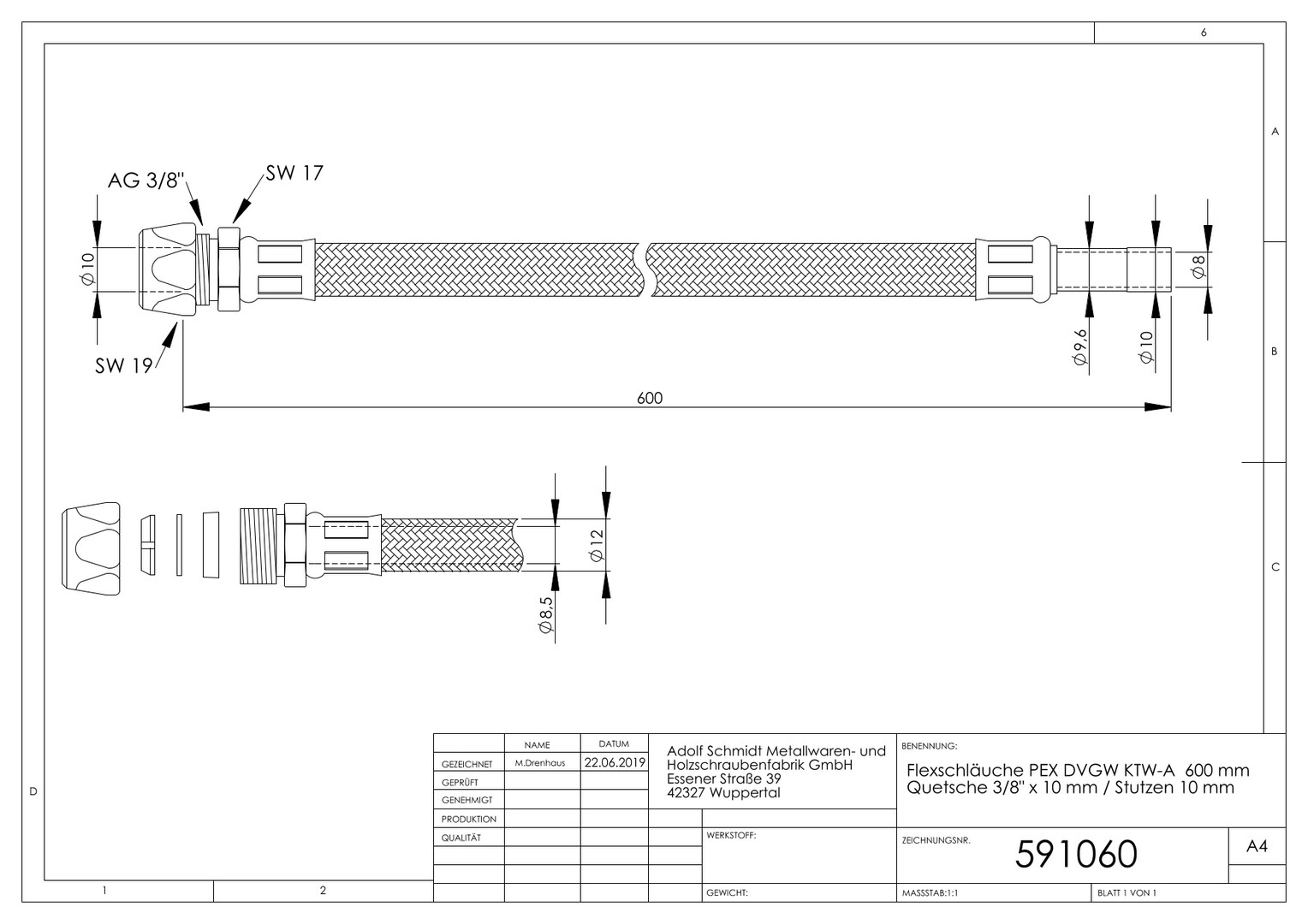 ASW Flex-Trinkwasserschlauch 600 mm, 3/8"x10mm Quetschverschraubung, 10mm Rohrstutzen