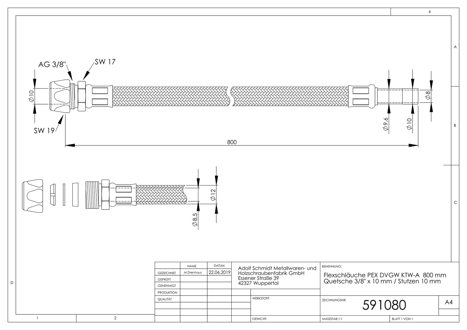 ASW Flex-Trinkwasserschlauch 800 mm, 3/8"x10mm Quetschverschraubung, 10mm Rohrstutzen