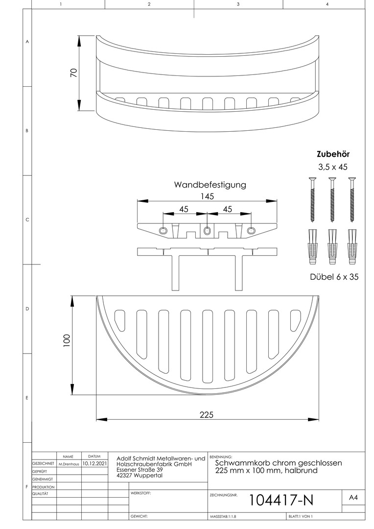 ASW Schwammkorb verchromt, geschlossen, 225x100mm, halbrund, komplett mit Befestigung
