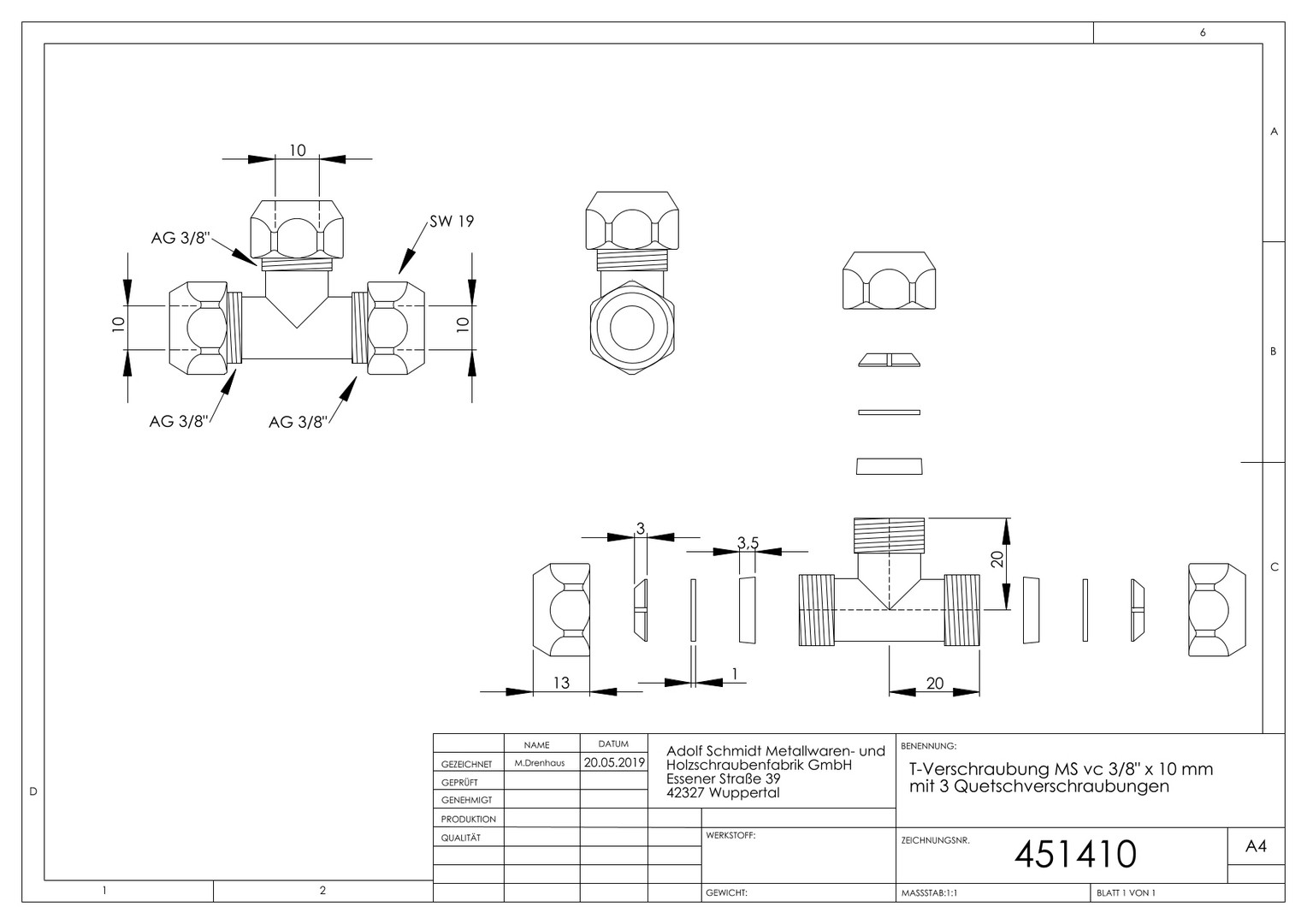 ASW T-Verschraubung 3/8" x 10 mm, Messing verchromt, mit 3 Quetschen TVS1010QUVC