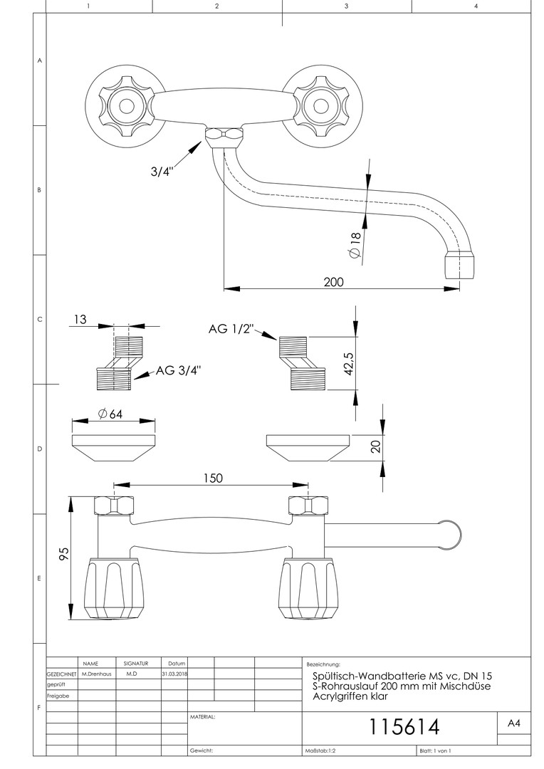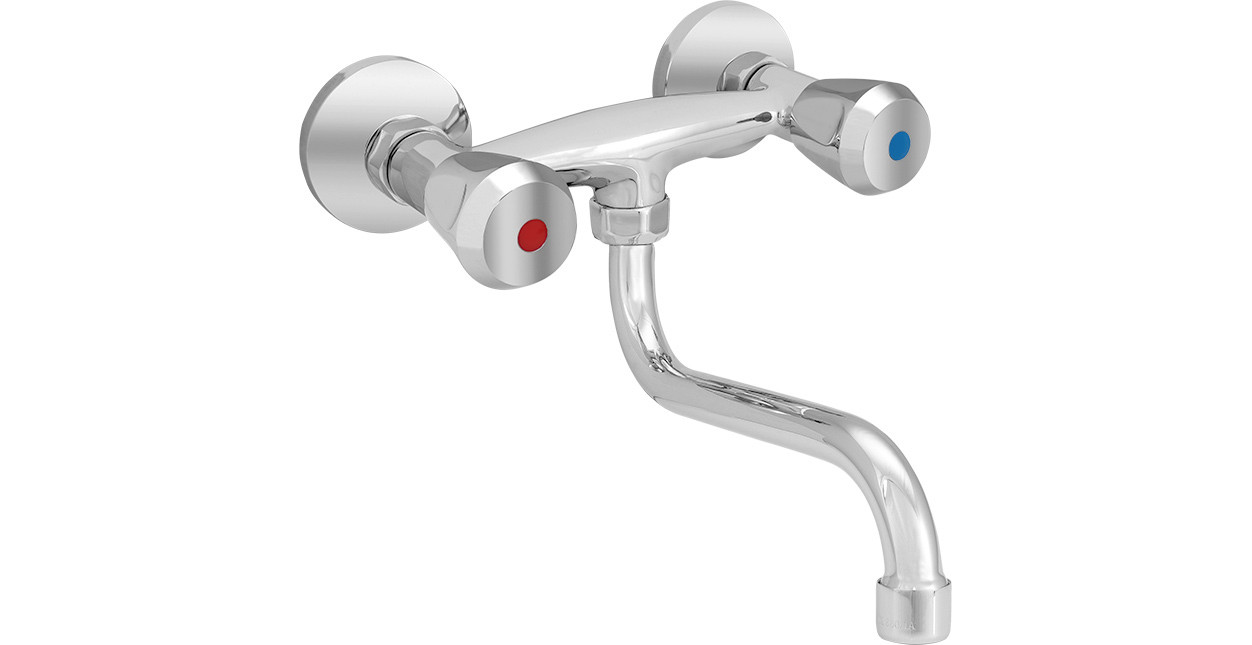 ASW Wand-Spültisch-Zweigriff-Armatur DN 15, schwenkbar 200mm, Messing verchromt, Acrylgriff klar