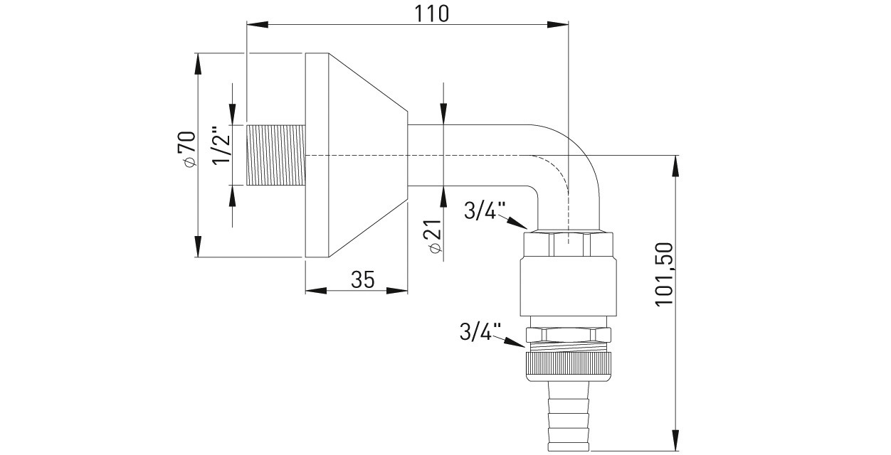 ASW Wandanschlussbogen 1/2" x 3/4", 90°, Messing verchromt, Schlauchverschraubung, Rohrbelüfter, verlängert