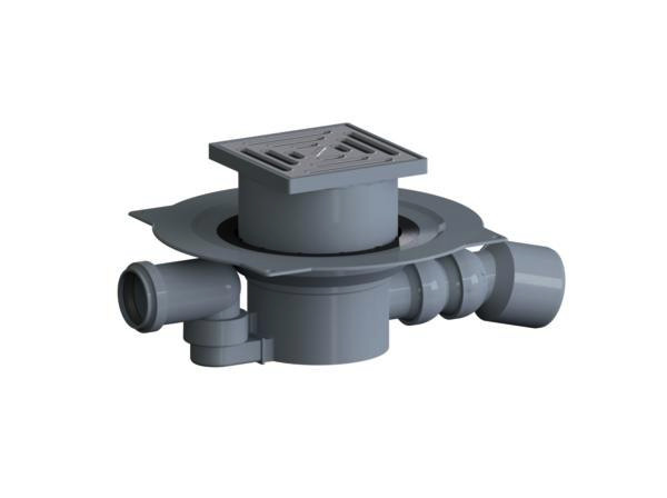 nach DIN EN 1253, Ablaufstutzen DN 50/DN 70 seitlich, mit Doppelkugelgelenk, verstellbar von 0-55°, höhenverstellbarer Aufsatz KE 15, Geruchsverschluss, Sperrwasserhöhe 50 mm (gemäß DIN EN 1253), Reinigungsöffnung, Bauschutzdeckel, Polypropylen, hochschlagfest, Rahmen Polypropylen, 150 x 150 mm, Rost Edelstahl 1.4301, Belastungsklasse K 3 (300 kg)