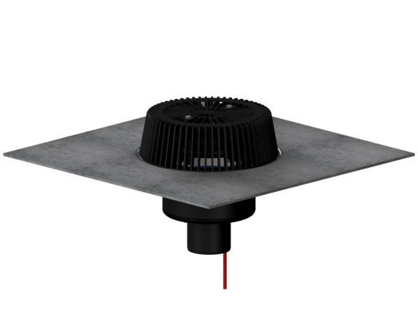 Ablaufleistungen nach DIN EN 1253, für den Einbau in Dachentwässerungsanlagen mit Druckströmung, Ablaufgehäuse wärmegedämmt, Ablaufstutzen senkrecht, SuperDrain-Einsatz, Laubfangkorb, verschraubt, Polypropylen, UV-stabilisiert, werkseitig aufgeschweißter Bitumenschweißbahn-Manschette, 500 x 500 mm, 5 mm stark, Edelstahl-Flanschring zur zusätzlichen Sicherheit, Direktanschluss an 230 V, Heizband nach VDE 0721, Teil 1/3.78 geprüft, Leistungsaufnahme pro Dachablauf 15 W, Rechnungswert für Absicherung pro Dachablauf 0,06 Ampere, empfohlene Absicherung pro Dachanlage 16 Ampere