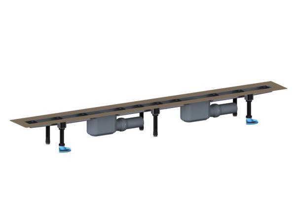 Bauhöhe 110 mm, nach DIN EN 1253, für die Montage in der Fläche, mit zwei Ablaufgehäusen, Ablaufstutzen DN 50 seitlich, mit Kugelgelenk verstellbar von 0–15°, schallentkoppelnde Montagefüße zur Höheneinstellung, besandeter Flansch zum sicheren Anschluss an Verbundabdichtungen gemäß DIN 18534, herausnehmbarer Geruchs- und Reinigungsverschluss, Sperrwasserhöhe 50 mm (gem. DIN EN 1253), höhenverstellbare Justierschrauben, Bauschutz, Fliesenanschlag, Rahmenklemmstück, Rinnenkörper Edelstahl 1.4301, Ablaufkörper Polypropylen, hochschlagfest