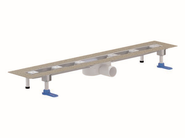 Bauhöhe 68 mm, für die Montage in der Fläche, mit einem Ablaufgehäuse, Ablaufstutzen DN 50 horizontal, schallentkoppelnde Montagefüße zur Höheneinstellung, besandeter Flansch zum sicheren Anschluss an Verbundabdichtungen gem. DIN 18534, herausnehmbarer Geruchs- und Reinigungsverschluss, Sperrwasserhöhe 24 mm (abweichend von DIN EN 1253), höhenverstellbare Justierschrauben, Bauschutz, Fliesenanschlag, Rahmenklemmstück, Rinnenkörper Edelstahl 1.4301, Ablaufkörper Polypropylen, hochschlagfest