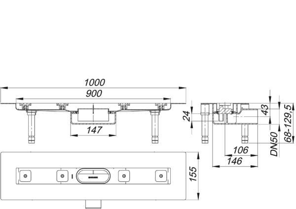 Bauhöhe 68 mm, für die Montage in der Fläche, mit einem Ablaufgehäuse, Ablaufstutzen DN 50 horizontal, schallentkoppelnde Montagefüße zur Höheneinstellung, besandeter Flansch zum sicheren Anschluss an Verbundabdichtungen gem. DIN 18534, herausnehmbarer Geruchs- und Reinigungsverschluss, Sperrwasserhöhe 24 mm (abweichend von DIN EN 1253), höhenverstellbare Justierschrauben, Bauschutz, Fliesenanschlag, Rahmenklemmstück, Rinnenkörper Edelstahl 1.4301, Ablaufkörper Polypropylen, hochschlagfest