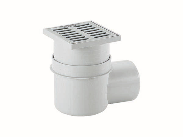 Ablaufstutzen seitlich (3 Grad), Geruchs- und Reinigungsverschluss, Sperrwasserhöhe 60 mm (gemäß DIN EN 1253), Haarsieb, höhenverstellbarem Aufsatz, Ablaufkörper und Rahmen Polypropylen, hochschlagfest, Rahmen Polypropylen, 150 x 150 mm, Belastungsklasse K 3 (300 kg)
