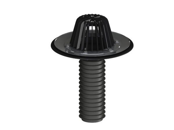 nach DIN EN 1253, zum Hineinstecken in vorhandene Dachabläufe/Entwässerungsrohre, mit Edelstahl-Flanschring zur Befestigung von polymeren Dachdichtungsbahnen, angeformte Lippendichtungen, Laubfangkorb, Bauschutzdeckel, Polypropylen, UV-stabilisiert, TPE-thermoplastisches Elastomer