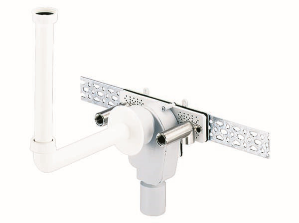 nach DIN 19541, kleines strömungsgünstiges Gehäuse, Montageplatte, Leifeld-Montageschiene, 2 Ms-Wandscheiben, höhenverstellbarer Anschlussbogen, Abdeckrosette ABS, herausnehmbarer Geruchsverschlusseinsatz, Siphongehäuse Polypropylen, hochschlagfest