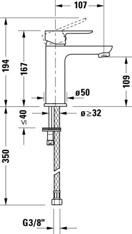 Standmontage, Ausladung 107 mm, flexible Anschlussschläuche 3/8", Normalstrahl, Temperaturbegrenzung einstellbar, geeignet für Durchlauferhitzer, Anzahl Griffe 1