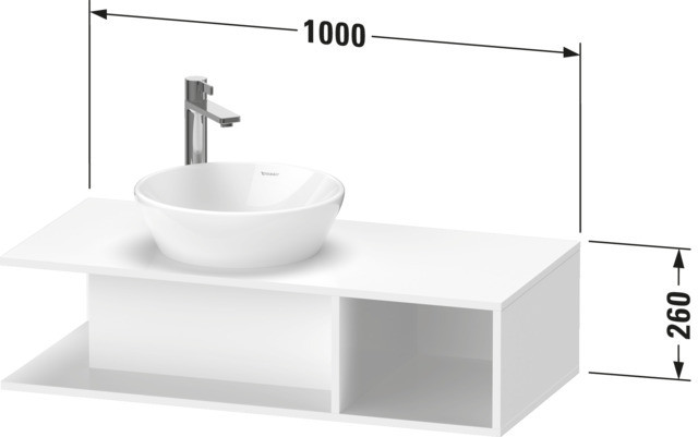 Höhe 26 cm, 1 offenes Fach seitlich rechts, 1 Konsolenplatte mit einem Ausschnitt, nur mit Raumsparsiphon montierbar
