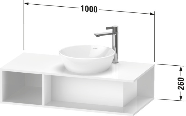 Höhe 26 cm, 1 offenes Fach seitlich links, 1 Konsolenplatte mit einem Ausschnitt, nur mit Raumsparsiphon montierbar