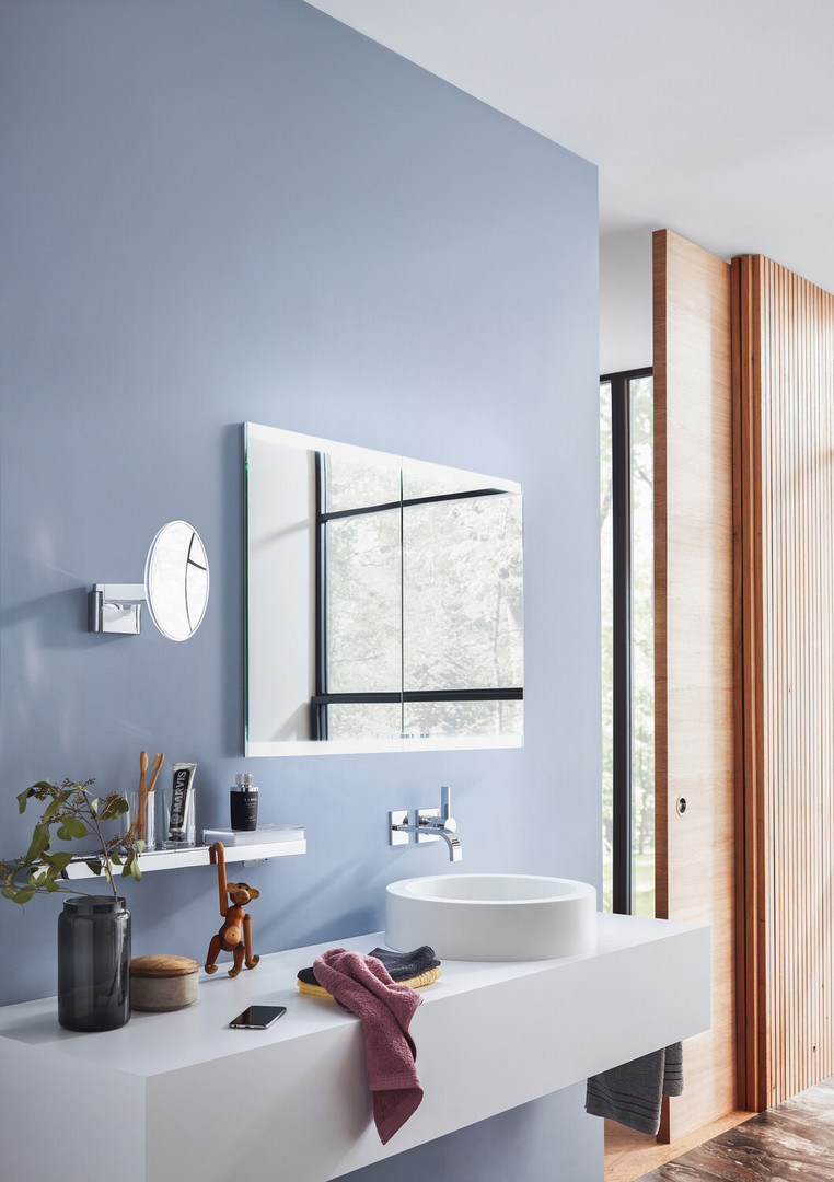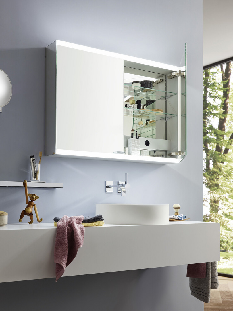 IP 20, mit lightsystem: Bedienung der Funktionen Ein/Aus, Lichtstärke, Lichtfarbe (2.700 bis 6.500 K) und Szenenauswahl (Cosmetic, Energizing, Relaxing) über App, Controller oder direkt am Touch-Bedienfeld, Vernetzung verschiedener Lichtquellen über Bluetooth, ohne lightsystem: 2 Lichttaster (Helligkeit und Lichtfarbe -kalt/warm-stufenlos dimmbar), waagerechte LED-Beleuchtung, verspiegelte Rückwand, 2 stufenlos einstellbare Glasablagen, 2 Steckdosen