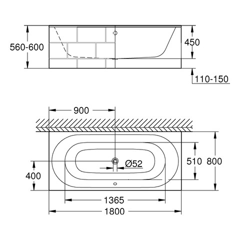 GROHE Badewanne Essence 180 x 45 x 80 cm, Montage von oben, mit Überlauf, alpinweiß