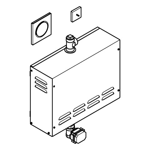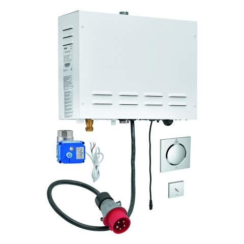 bestehend aus Dampfgenerator 3.3-9.9 kW, geeignet für Kabinen bis 16 m3, Spannungsversorgung 400 V 3L+N+PE AC, 50 Hz, Leistung 9,9 kW, Wassereingang 3/4", Arbeitsdruck 1-10 bar (via Druckminderer), automatische Entleerung, Wasserausgang 1/2", Dampfauslass 1/2", Schutzart IP 23, Dampfauslass mit Vertiefung für Duftöl, 127 x 127 mm, Anschlussgewinde 1/2", Temperaturfühler, 60 x 60 x 12 mm, SpeedClean Antikalk-System, Long-Life Oberfläche, erfordert Rohbau-Set (29 414 000), Steuereinheit (26 864 000 oder 36 476 000), Bluetooth-Empfangseinheit (36 475 000) und Kabelverbindungen - Komponenten müssen je nach Einbausituation separat bestellt werden