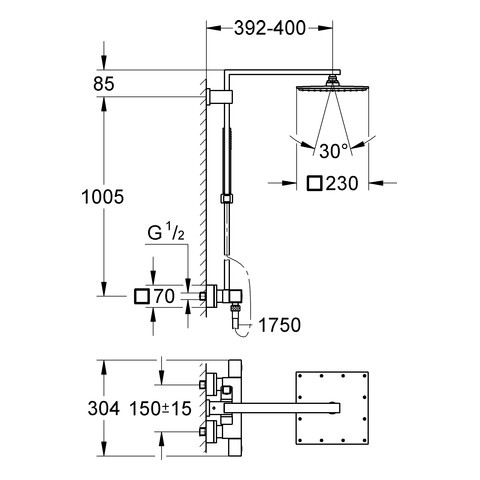 bestehend aus Brausearm, Aufputz-Thermostat mit Aquadimmer Funktion, ermöglicht den Wechsel zwischen Rainshower Allure 230 Kopfbrause (27 479), Material Metall, Strahlart: Rain, mit Kugelgelenk, Drehwinkel +/-15°, Handbrause Euphoria Cube (27 699), in der Höhe verstellbar mittels Gleitelement, Brauseschlauch Silverflex 175 cm (28 388), TurboStat Kompaktkartusche mit Dehnstoff-Thermoelement, SafeStop Sicherheitssperre bei 38 °C, SafeStop Plus optional einsetzbarer Temperaturendanschlag bei 43 °C, DreamSpray Strahlbild, Long-Life Oberfläche, SpeedClean Antikalk-System, TwistStop gegen Verdrehen des Brauseschlauchs, für Durchlauferhitzer ab 18 kW/h geeignet, Mindestdurchfluss 7 l/min
