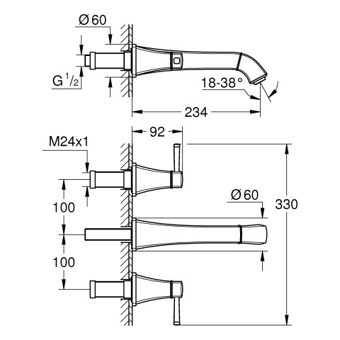 GROHE Fertigmontageset Grandera UP-3-Loch-Waschtischarmatur, 1/2", Ausladung 23,4cm, chrom