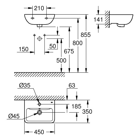 GROHE Handwaschbecken BauEdge Keramik 45x35cm, 1 Hahnloch, mit Überlauf, wandhängend, alpinweiß