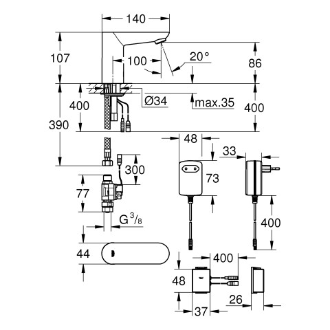 GROHE Infrarot-Waschtisch-Armatur Cosmopolitan E Bluetooth 1/2", ohne Mischung, Netzbetrieb, chrom