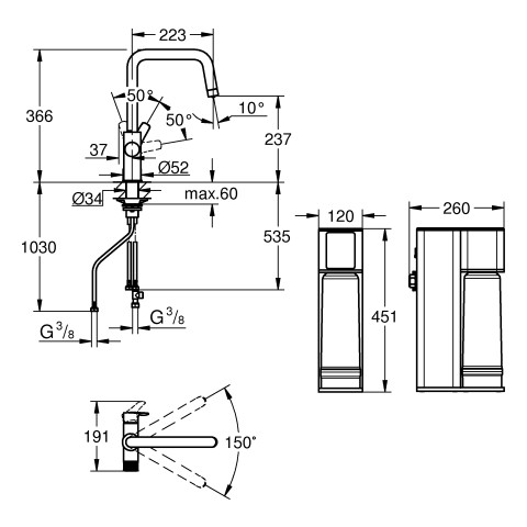 separater Griff für gefiltertes Wasser, SilkMove 28 mm Keramikkartusche, schwenkbarer Rohrauslauf, Schwenkbereich 150°, getrennte Wasserführung für gefiltertes und ungefiltertes Wasser, flexible Anschlussschläuche, Blue Umkehrosmose System, Umkehrosmose Filter für reines und sicheres Wasser, Filterung von Chemikalien, Hormonen und Mikroorganismen, Durchfluss 1,5 l/min, Salzabweisung mehr als 97 %, Wirkungsgrad min. 50 %, Speisewasser Druck 1-4 Bar, 230 V/50 Hz, kein Wasserspeicher erforderlich, Filterlebensdauer 1 Jahr, Anschluss Set