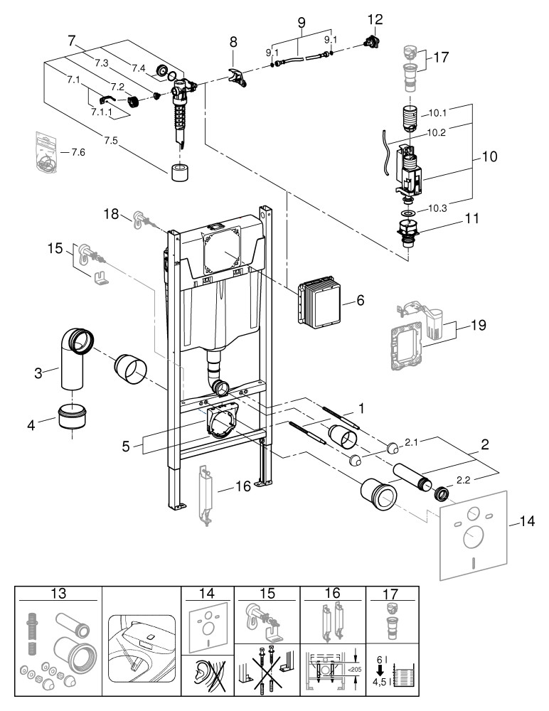 für Vorwand- oder Ständerwandmontage, Stahlrahmen, mit Schnellverstellung und Höhensicherung, Befestigungsmaterial, 2 WC-Haltebolzen, Keramikbefestigung, Schraubenabstand 18/23 cm, Ablaufbogen Ø 9 cm, tiefenverstellbar, Reduzierstück Ø 9/11 cm, Zu- und Ablaufgarnitur, Spülkasten GD 2, 6-9 l, werkseitiger Einstellung 6 l und 3 l, pneumatisches Ablaufventil mit zwei Funktionen 2 Mengen oder Start & Stopp, Wasseranschluss von links/rechts/hinten oder oben, Armaturengruppe I, schwitzwasserisoliert, Wasseranschluss 1/2", mit integriertem Eckventil und werkzeugloser Schlauchverschraubung, werkzeuglos montierbarer Revisionsschacht mit Rohbauschutz, senkrechte und waagerechte Montage, Wandwinkel 38 558 00M für Vorwandmontage und Revisionsschacht 40 911 000 für kleine Abdeckplatten müssen separat bestellt werden