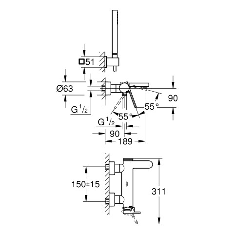GROHE Wannen-Einhebelmischer PLUS 1/2", mit Brausegarnitur, Laminarstrahlregler, Wandmontage, chrom