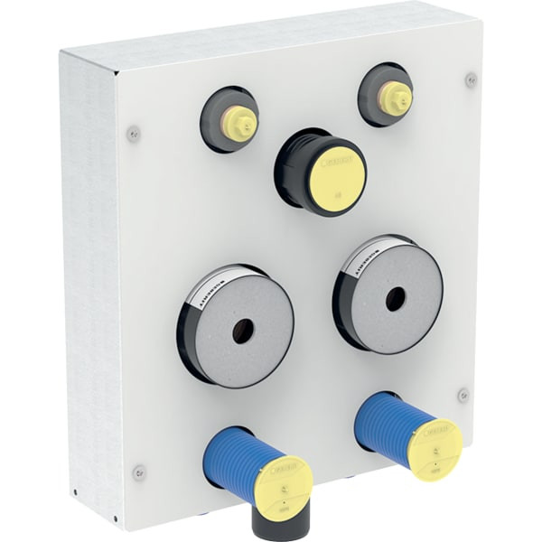 Geberit AP-Armaturenblock mit zwei Wasserzählerstrecken, zwei UP-Absperrventilen und einem Anschluss-T-Stück