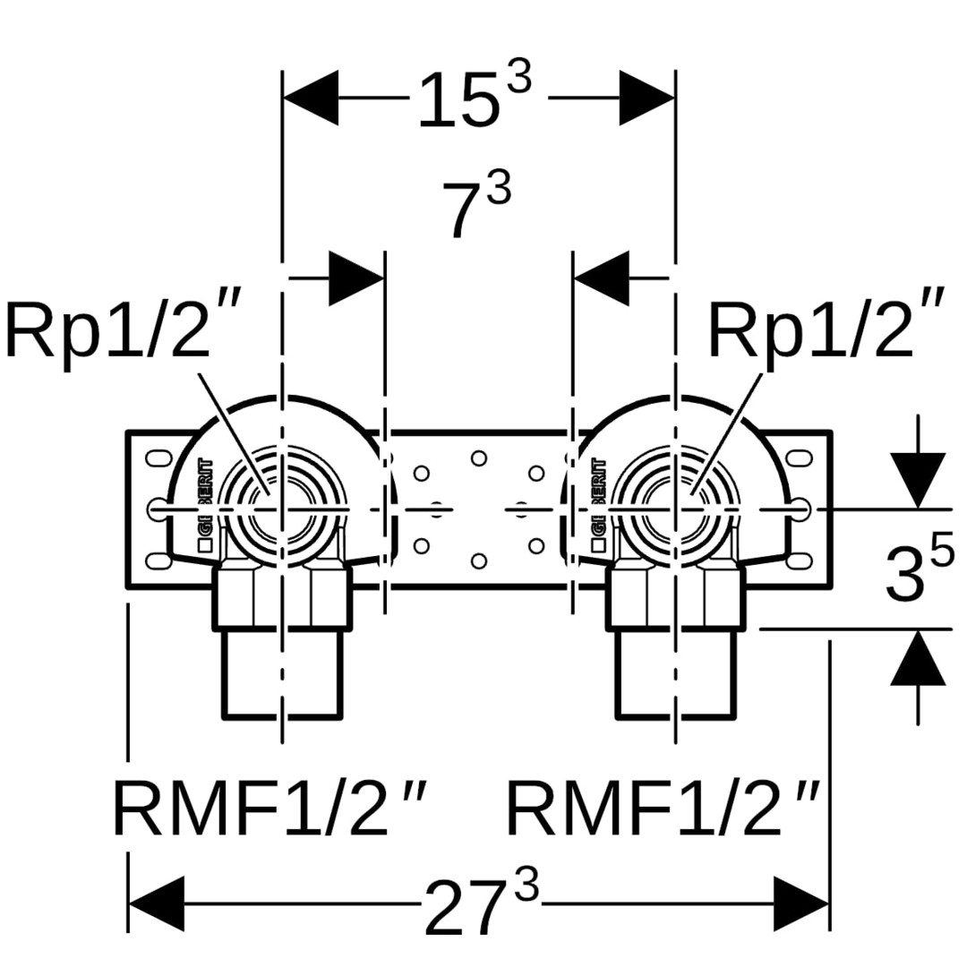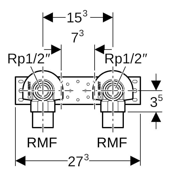 Geberit Anschlusswinkel RMF 1/2 x Rp 1/2, 27,3 cm, 90Grad, 2-fach GE632865002