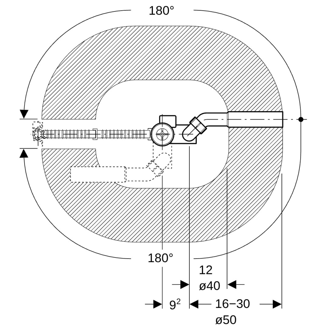 für Badewannen mit Ventilloch Ø 52 mm, aus Stahl, Kunststoff oder Guss, in Spezialgröße, Güteüberwacht nach EN 274-3, mit Überlauf, Überlaufkopf ausgerichtet befestigbar, doppelseitige Dichtungen an Ab- und Überlauf, mit Ablaufventil, Geruchsverschluss, Anschlussbogen aus PE-HD, Ø 40/50 mm, Bauschutz und Befestigungsmaterial