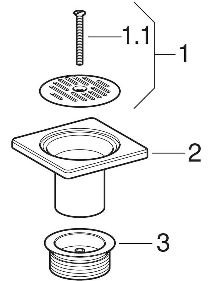 zum Einbau innerhalb von Gebäuden, für Bodenentwässerung, Duschen, Verbundabdichtungen, güteüberwacht nach EN 1253-3, poliert, Belastbarkeit Klasse H 1.5 (1,5 kN), bestehend aus Ablaufventil, Trichter, Linsensenkschraube, Sieb