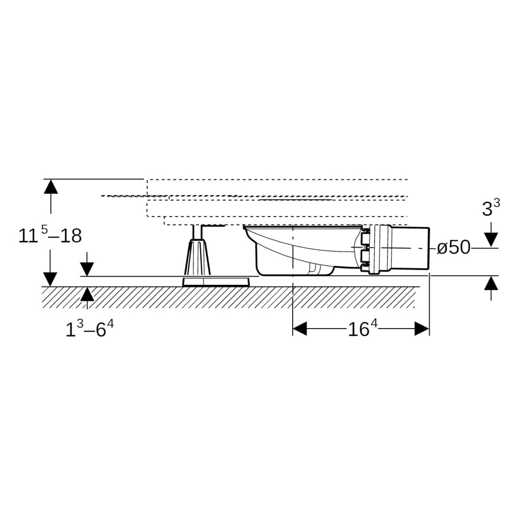 zum Einbau innerhalb von Gebäuden, zur Entwässerung von Geberit CleanFloor30 Duschflächen integriert, für Fußbodenaufbauten bis Oberkante Fertigfussboden 11,5–18 cm, zum Befestigen an Geberit Duofix Installationsrahmen für Duschflächen, zum Einsatz als Bodenablauf mit Abgang horizontal, DN50, Durchmesser 5 cm