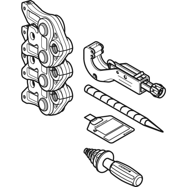 bestehend aus 2x Pressbacken, Rohrschneider, Fettstift mit versenkbarer Mine, gelb, PowerTest, Entgrat- und Kalibrierwerkzeug, servicefrei, Einhändig bedienbar, für Funktionsprüfung mit PowerTest geeignet, zum Verpressen von Mepla Pressfittings