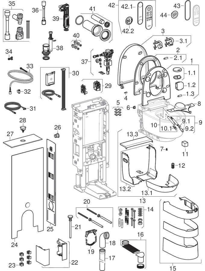 mit TurboFlush-Spültechnik, WC-Sitzring und WC-Deckel mit SoftClosing, WC-Deckel mit SoftOpening, Benutzererkennung, Analdusche mit Doppeldüsen-WhirlSpray-Duschtechnologie, Oszillierdusche (automatische Vor- und Rückwärtsbewegung des Duscharms) einstellbar, separate Ladydüse in geschützter Ruheposition, Duschstrahlstärke in fünf Stufen einstellbar, Duscharm in fünf Stufen positionierbar, automatische Vor- und Nachreinigung der Duschdüse mit Frischwasser, hybrides Warmwassersystem mit Durchlauferhitzer und Warmwasserspeicher, Temperatur des Duschwassers einstellbar, Entkalkungsprogramm, Föhn zuschaltbar, Föhnarm ausfahrbar, Temperatur des Föhns einstellbar, 4 Benutzerprofile programmierbar, Funktionen und Einstellungen über Fernbedienung, mit integriertem Aufputz-Spülkasten, Wasseranschluss extern, mit Zubehör möglich, Netzanschluss extern, mit Steckdose rechts möglich, Zulassung nach DIN EN 1717/DIN EN 13077, bestehend aus Kupplungsbuchse für Netzanschluss, Spritzschutz, Entkalkungsmittel 125 ml, Reinigungsset, Anschlussset für WC, Ø 90 mm, Fernbedienung mit Wandhalterung und Batterie CR2032, Befestigungsmaterial