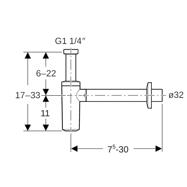 Geberit Tauchrohrsiphon für Waschbecken, Abgang horizontal, Steckdichtung, Wandrosette: d=32mm, G=1 1/4", chrom / glänzend