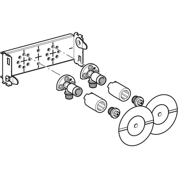 zum Einbau in GIS Tragsysteme für Vorwand, Trennwand oder frei stehende Wand, zum Anschließen von AP-Armaturen mit Stichmaß 10 cm, im GIS Tragwerk stufenlos höhenverstellbar, Traverse verzinkt, mit zwei Schnellbefestigungen, Abdichtscheibe selbstklebend und vliesbeschichtet, Schutzstopfen für Druckprüfung mit Kaltwasser bis max. 15 bar/1500 kPa, bestehend aus 2x Anschlusswinkel Rp 1/2-R 1/2, MeplaFix-fähig, 2x Schalldämmunterlagen, 2x Dämmhülsen, 2x Schutz- und Markierstopfen, 2x Abdichtscheiben und Befestigungsmaterial
