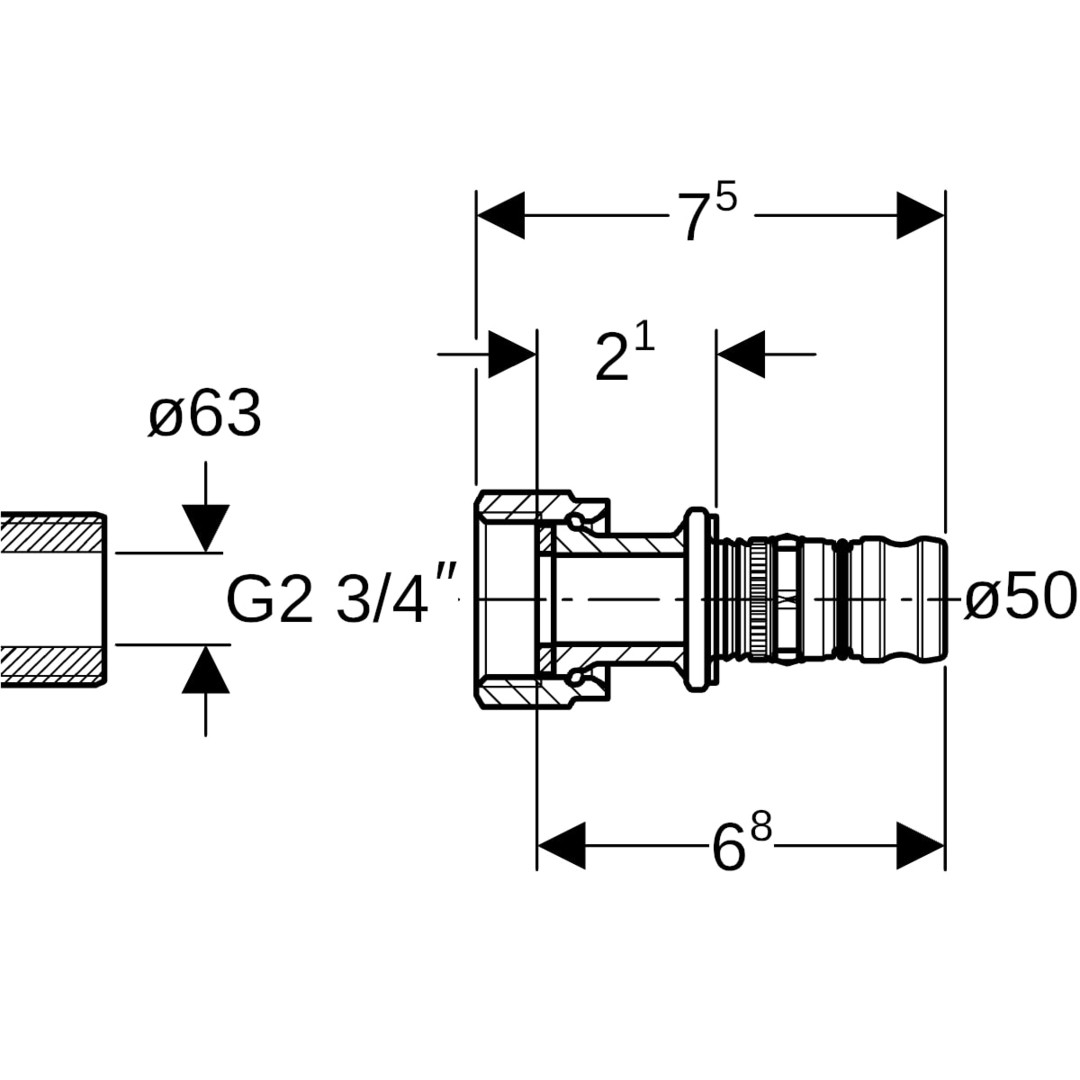 Geberit Übergang Mepla Ø 50 mm x G 2 3/4, mit Überwurfmutter, Rotguss