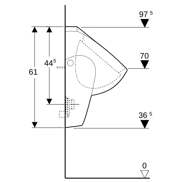 36 x 61 x 37 cm, aus Sanitärkeramik, zum Betrieb mit automatischer, wassersparender Spülung, für Aufputz-Urinalsteuerungen, wandhängend, mit Spülrand, Geruchsverschluss verdeckt, verdeckte Befestigung, erfüllt Anforderungen nach EN 13407