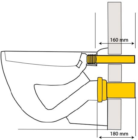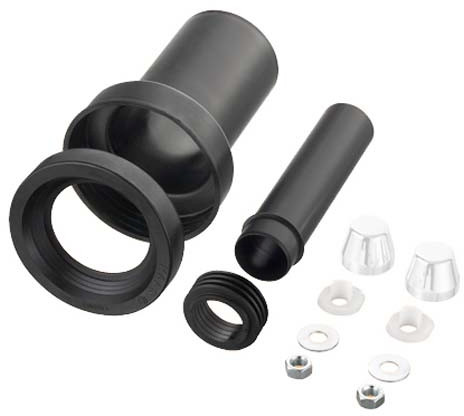 für wandhängende WC´s mit Einlaufstutzen 55 mm Innendurchmesser, Einschubhöhe 135 mm, geprüft nach DIN 1389, Dichtungen aus EPDM alterungs- und witterungsbeständig nach DIN EN 681-1, bestehend aus: Spülrohrverbinder 45 x 185 mm und Gummilippendichtung und WC-Anschlussstutzen mit Gummistülpdichtung, Abdeckkappen, Exzenterscheiben, Unterlegscheiben, Muttern M 12 und Montageanleitung