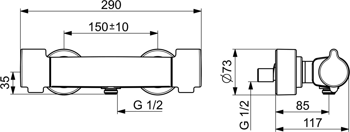 Dusch-Thermostat, Wandmontage, Heißwasserversorgung max. +80° C, Arbeitsdruck 1 - 10 bar, Durchfluss bei 3 bar: 15.6 l/min, Anschlussgröße G 1/2", Installationsabstand 150 ± 10 mm, Sicherungseinrichtung (EN1717) EB, Geräuschklasse I (ISO 3822), Geräuschklasse 0.2 l/s: I (ISO 3822), DVGW: NW-6509CR0103, Material aus Messing, EPD: S-P-06397, ABP: PA-IX 29962/IB, Heißwassersperre einstellbar (im Lieferumfang enthalten), Sicherheitssperre gegen Verbrühen bei 38° C, THERMO COOL: Mehr Sicherheit durch minimales Erwärmen des Armaturengehäuses, Temperatureinstellgriff, Durchflusseinstellgriff, Eco-Funktion für die Wassermenge, Armaturenkörper aus entzinkungsbeständigem Messing (DZR), Wasserwege ohne Nickelbeschichtung, thermische Desinfektion nach DVGW W551 ohne erneute Regelteil Einjustierung möglich, Verbrühschutz durch Temperaturendanschlag 38° C (36°-44°), Oberteil mit keramischen Dichtscheiben zur Wassermengeneinstellung für einen Abgang, Thermostatkartusche zur Temperaturreglung, Rückflussverhinderer, Schmutzfilter S-Anschlüsse, Abdeckung(en), mit integrierter Vorabsperrung, Schalldämpfer, Rosetten 3-fach abgedichtet