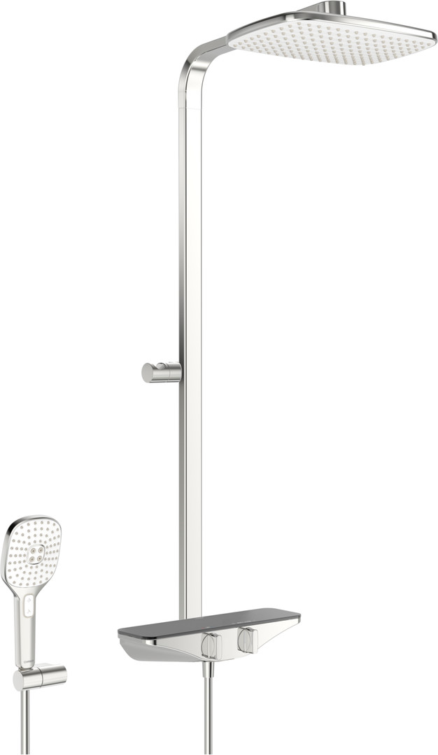 DN 15, Wandmontage, Durchflussmenge 13,8 l/min, gemessen bei 3 bar Fließdruck, Heißwasserversorgung max. 80 °C, integrierter Umsteller mit Absperrung, Drehumsteller, druckunabhängig, Anti-Kalk-Technik, eigensicher gegen Rückfließen im häuslichen Gebrauch (nach DIN EN 1717), Kopfbrause eckig 360 x 220 mm, Handbrause 110 x 120 mm, Brausehalter, Brauseschlauch (1750 mm), schwenkbares Kugelgelenk, Temperatureinstellgriff, Durchflusseinstellgriff, Sicherheitssperre gegen Verbrühen bei 38 °C, THERMO COOL minimales Erwärmen des Armaturengehäuses, Kugelkopf-S-Anschlüsse, G 1/2, Thermostatkartusche zur Temperaturreglung, Rückflussverhinderer