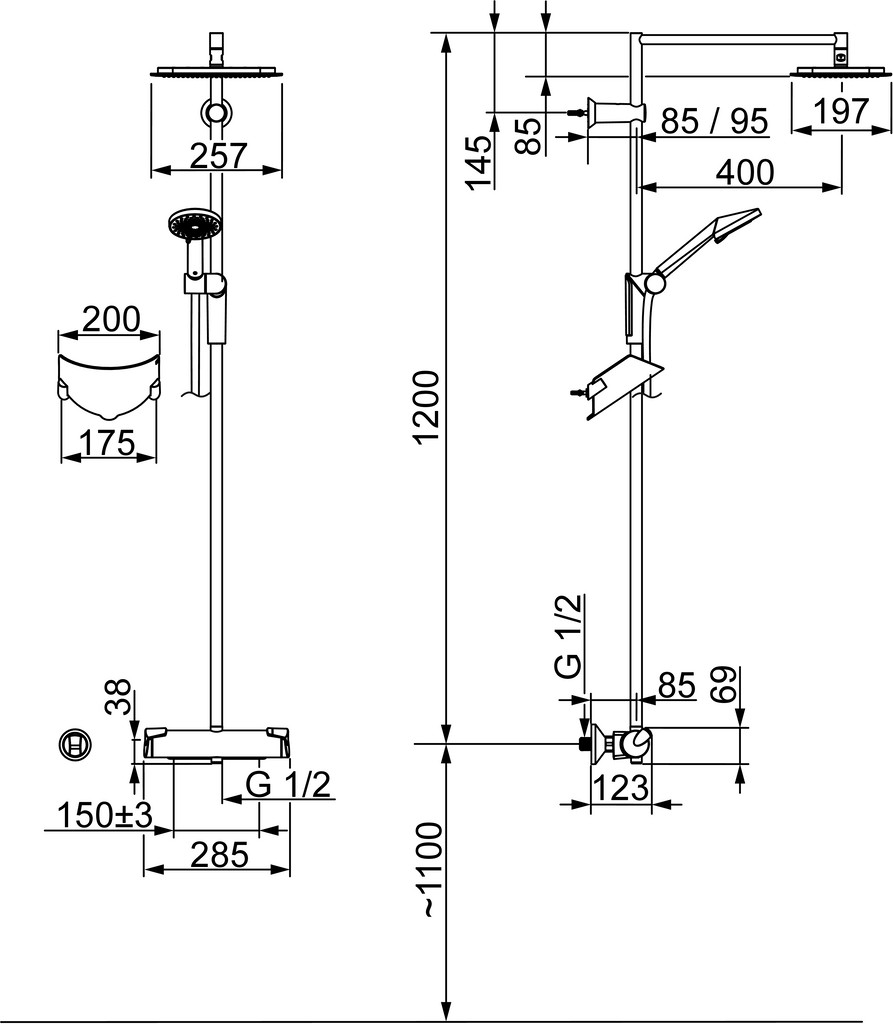 DN 15, Wandmontage, Durchflussmenge 16,2 l/min, gemessen bei 3 bar Fließdruck, Heißwasserversorgung max. 65 °C, Drehumsteller, druckunabhängig, integrierter Umsteller mit Absperrung, Anti-Kalk-Technik, kürzbar, eigensicher gegen Rückfließen im häuslichen Gebrauch (nach DIN EN 1717), Kopfbrause eckig 257 x 197 mm, Handbrause Ø 94 mm, Brausestange 1200 mm, verstellbare Brausestangehalterung, Seifenschale, Brauseschlauch (2000 mm), Eco-Durchfluss, schwenkbares Kugelgelenk, 3-strahlig, Temperatureinstellgriff, Durchflusseinstellgriff, Sicherheitssperre gegen Verbrühen bei 38 °C, THERMOCOOL minimales Erwärmen des Armaturengehäuses, S-Anschlüsse, Thermostatkartusche zur Temperaturreglung, Befestigungsset, Rückflussverhinderer, Schmutzfilter