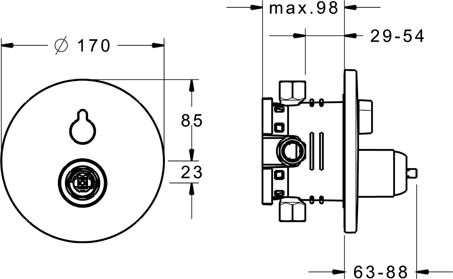 Heißwasserversorgung max. 80°C, Arbeitsdruck 0,5-10 bar, Durchfluss bei 3 bar 22,2 / 21 l/min, Material Messing, Ø 3,5 classic Steuerpatrone mit keramischen Dichtscheiben zur Wassermengen- und Temperatureinstellung, Funktionseinheit, Befestigung der Funktionseinheit mit Schrauben, Rosette rund, ohne Bedienhebel, Temperaturbegrenzer, Heißwassersperre einstellbar (im Lieferumfang enthalten), Drehumsteller, druckunabhängig