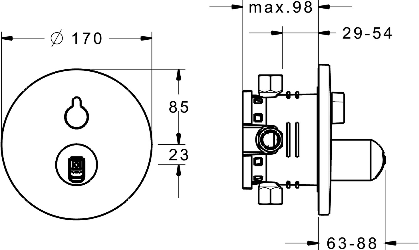 Durchflussmenge 22,2/21 l/min, gemessen bei 3 bar Fließdruck, Heißwasserversorgung max. 80 °C, Temperaturbegrenzer, Heißwassersperre einstellbar, Ø 3.5 classic Steuerpatrone mit keramischen Dichtscheiben zur Wassermengen- und Temperatureinstellung, Befestigung der Funktionseinheit mit Schrauben, ohne Bedienhebel