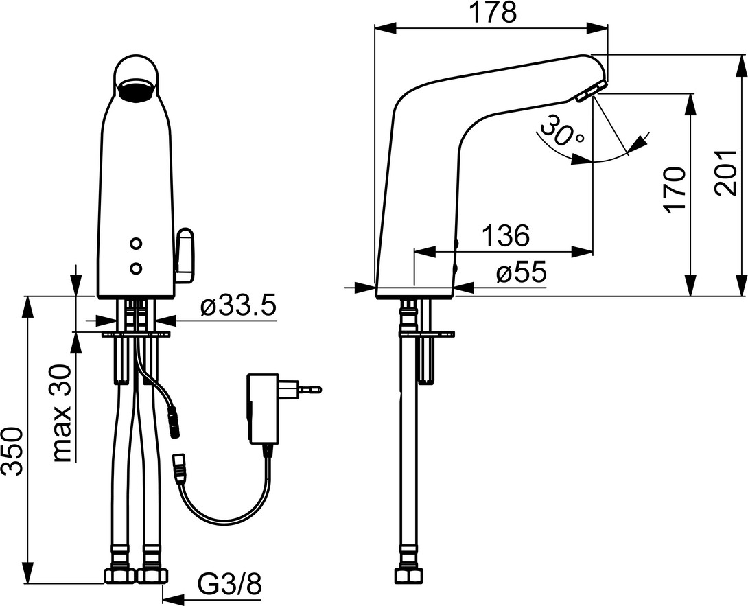 berührungslos, Steckernetzteil, Bluetooth fähig, Standmontage (1-Loch), DN15, Heißwasserversorgung max. +70°C, Arbeitsdruck 1 - 10 bar, Durchfluss bei 3 bar (mit Regler): 6 l/min, Anschlussgröße G 3/8", Ausladung 136 mm, Arbeitsspannung 9/12 V, Sicherungseinrichtung (EN1717) AA, Geräuschklasse I (ISO 3822), Schutzklasse IP 55 / transformer IP 20, Elektrischer Anschluß 230 / 9 V, Bluetooth version 4.x (D034445), Material aus Messing, Armaturenkörper aus entzinkungsbeständigem Messing, (DZR), Messing in Trinkwasserkontakt enthält weniger als 0,3% Blei, Wasserwege ohne Nickelbeschichtung, für kurze Zeitspannen thermisch desinfizierbar, Softwaresettings per App änderbar, Anschluss über flexible Druckschläuche, Spezialbeschichtung für hygienische Anforderungen, Heißwassersperre einstellbar (im Lieferumfang enthalten), feststehender Auslauf, gegossen, kristallklarer Laminarstrahl, Schmutzfilter, Mischventil zur manuellen Temperatureinstellung, Rückflussverhinderer PSD-Sensor mit Autofocus, Magnetventil, mit Netzteil, ohne Ablaufgarnitur, ohne Zugstangenbohrung, Temperatureinstellgriff