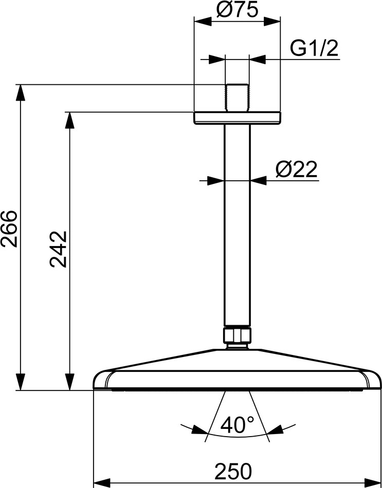 Heißwasserversorgung max. 65°C, Arbeitsdruck 0,5-5 bar, Durchfluss bei 3 bar (mit Begrenzer) 12 l/min, Anschlussgröße G1/2, Kopfbrausengröße 250 x 250 mm, Sicherungseinrichtung (EN1717) EB, Geräuschklasse I (ISO 3822), Material Messing/Verbundwerkstoff, Kopfbrause, schwenkbares Kugelgelenk, Anti-Kalk-Technik, 1-strahlig