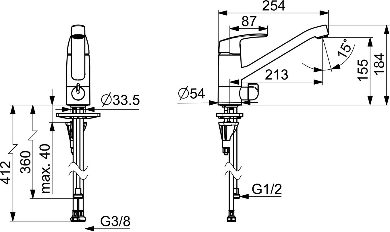 DN 15, Durchflussmenge 12 l/min, gemessen bei 3 bar Fließdruck, Heißwasserversorgung max. 80 °C, Armaturenkörper aus entzinkungsbeständigem Messing (DZR), 3S-Installation, System für sichere und schnelle Montage, Hebel mit W+K-Kennzeichnung, Temperaturbegrenzer, Anschluss über flexible Druckschläuche G 3/8, Ø 4 Steuerpatrone mit keramischen Dichtscheiben zur Wassermengen- und Temperatureinstellung, Schwenkbereich des Auslaufs 120° (80°/40°), Anschlag herausnehmbar, Auslaufprofil, gezogen, Cascade-Strahlregler