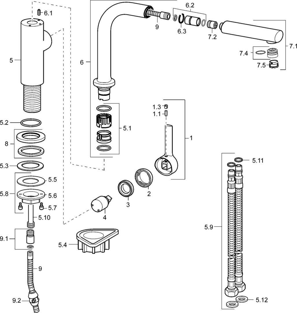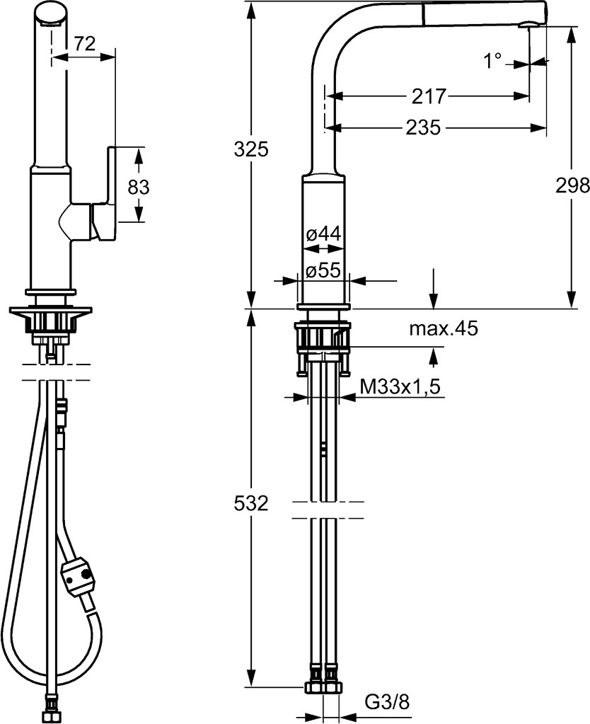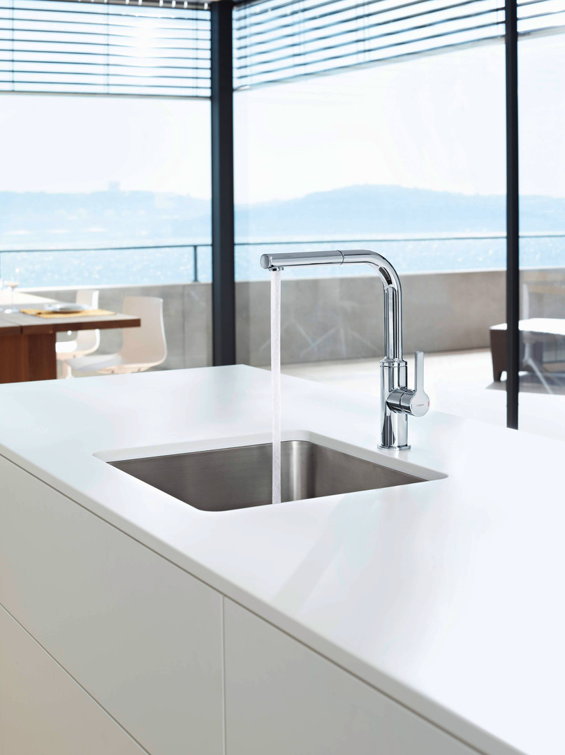 DN 15, Durchflussmenge 9 l/min, gemessen bei 3 bar Fließdruck, Heißwasserversorgung max. 80 °C, Armaturenkörper aus entzinkungsbeständigem Messing (DZR), Messing in Trinkwasserkontakt enthält weniger als 0,3 % Blei, Wasserwege ohne Nickelbeschichtung, eigensicher gegen Rückfließen im häuslichen Gebrauch (nach DIN EN 1717), Hebel mit W+K-Kennzeichnung, Anschluss über flexible Druckschläuche G 3/8, Ø 2,5 Steuerpatrone mit keramischen Dichtscheiben zur Wassermengen- und Temperatureinstellung, Rückflussverhinderer, Schwenkbereich des Auslaufs 150° (360°), Cascade-Strahlregler
