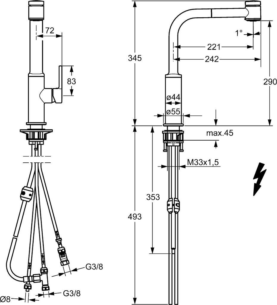 DN 15, Heißwasserversorgung max. 80 °C, 2-strahlig, Armaturenkörper aus entzinkungsbeständigem Messing (DZR), Messing in Trinkwasserkontakt enthält weniger als 0,3 % Blei, Wasserwege ohne Nickelbeschichtung, eigensicher gegen Rückfließen im häuslichen Gebrauch (nach DIN EN 1717), Hebel mit W+K-Kennzeichnung, Anschluss über Kupferrohre, Ø 2,5 Steuerpatrone mit keramischen Dichtscheiben zur Wassermengen- und Temperatureinstellung, Rückflussverhinderer, Schwenkbereich des Auslaufs 150° (360°), Cascade-Strahlregler, kristallklarer Laminarstrahl